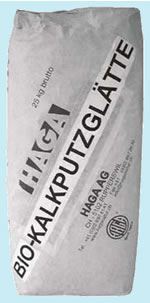 HAGA Bio-Kalkputzglätte ist eine rein mineralische, biologisch konzipierte Trockenmörtelmischung aus Kalksteinsteinmehl und Kalksand bis 0,5 mm. Die hochwertigen Bindemittel Weisskalkhydrat zusammen mit natürlichem Cellulose-Verzögerer ergeben eine besonders spannungsfreie und hochatmungsaktive Putzschicht
